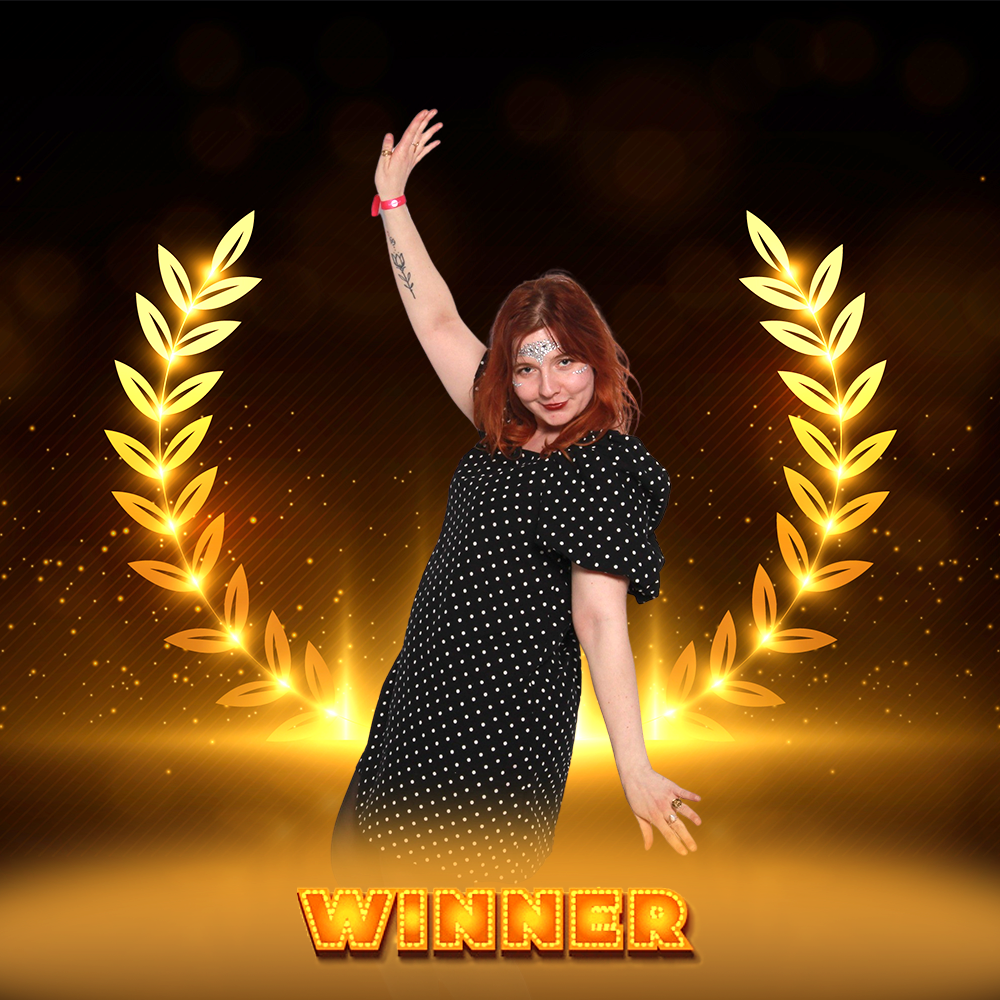 Lorsqu’un participant est tiré au sort, une mise en page spécifique s’applique de manière festive, sur l’interface de la borne photo, en affichant un message de félicitations ou tout autre message promotionnel. - Impression instantanée